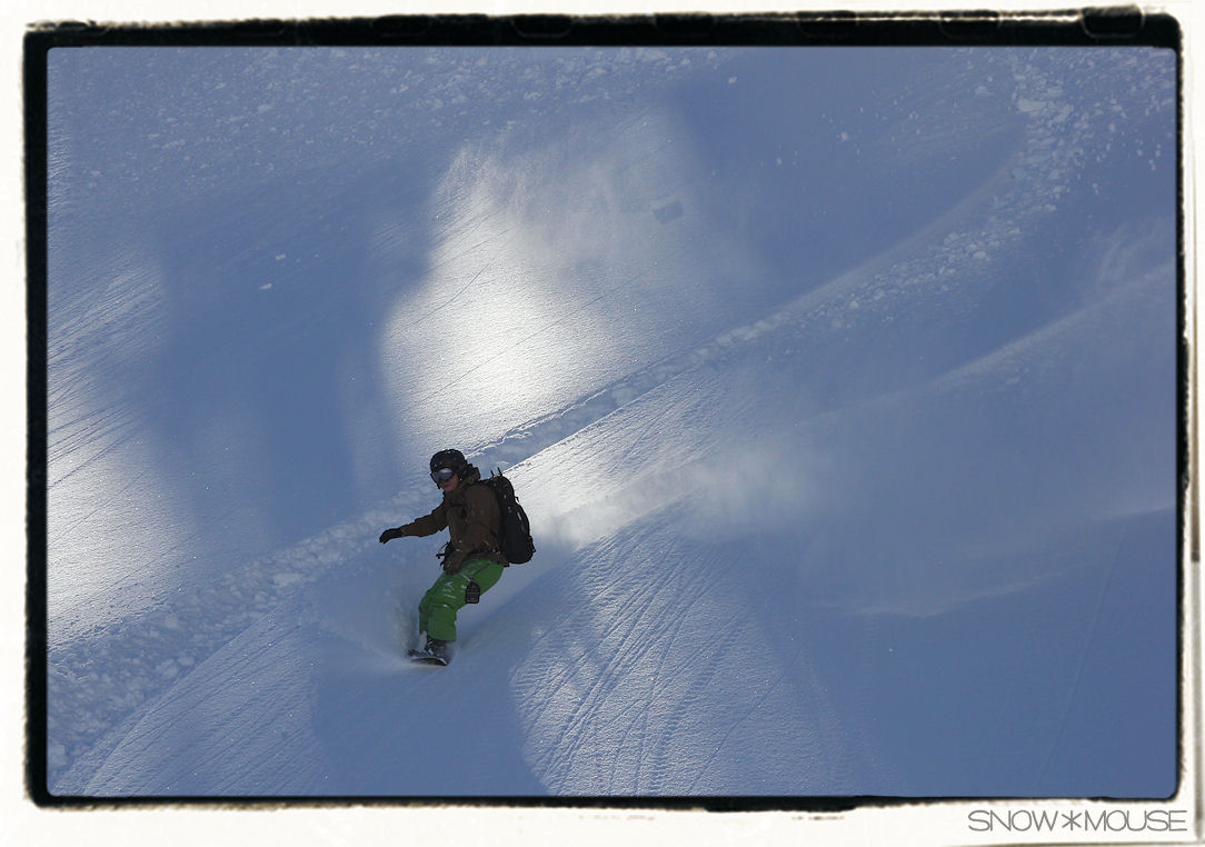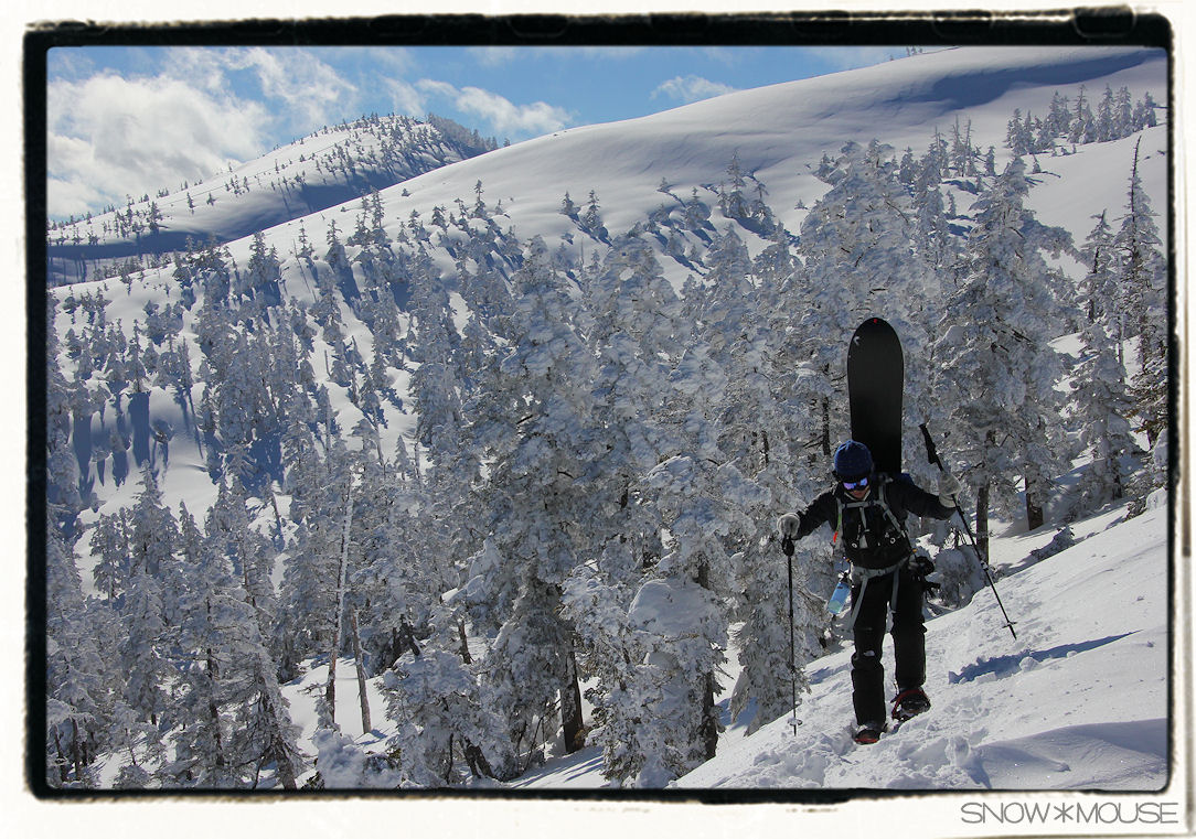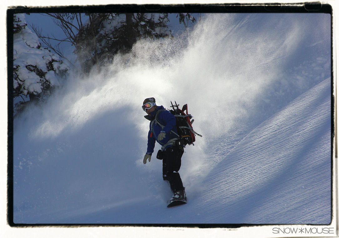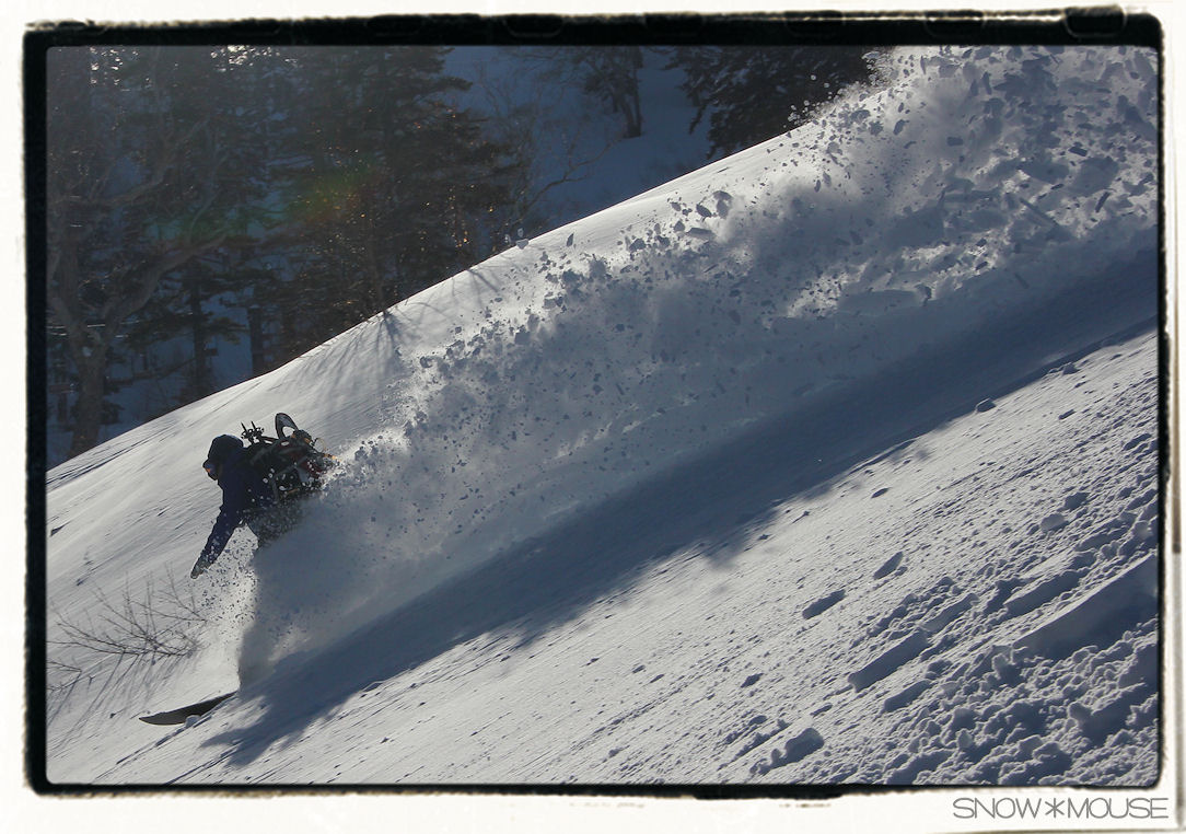 三日目、天候不良の予定が朝から快晴…。雪も腐るだろうし昼上がりだしと、近場の北斜面を目指して行動すると、なんと南面がまだまだフレッシュ、更に北面は極上の粉雪&差し込む光が芸術的なライティング!…