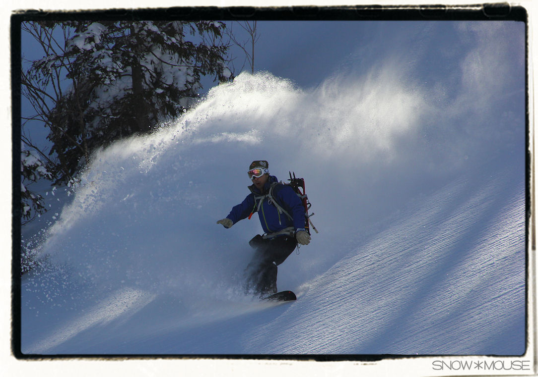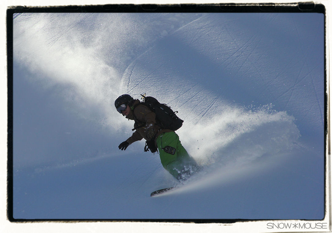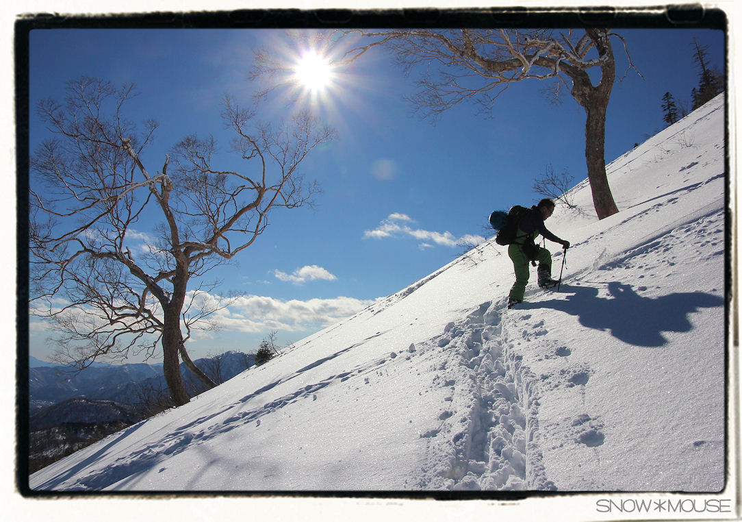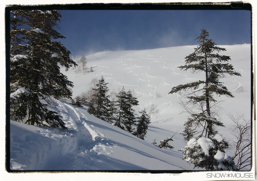 三日目、天候不良の予定が朝から快晴…。雪も腐るだろうし昼上がりだしと、近場の北斜面を目指して行動すると、なんと南面がまだまだフレッシュ、更に北面は極上の粉雪&差し込む光が芸術的なライティング!…