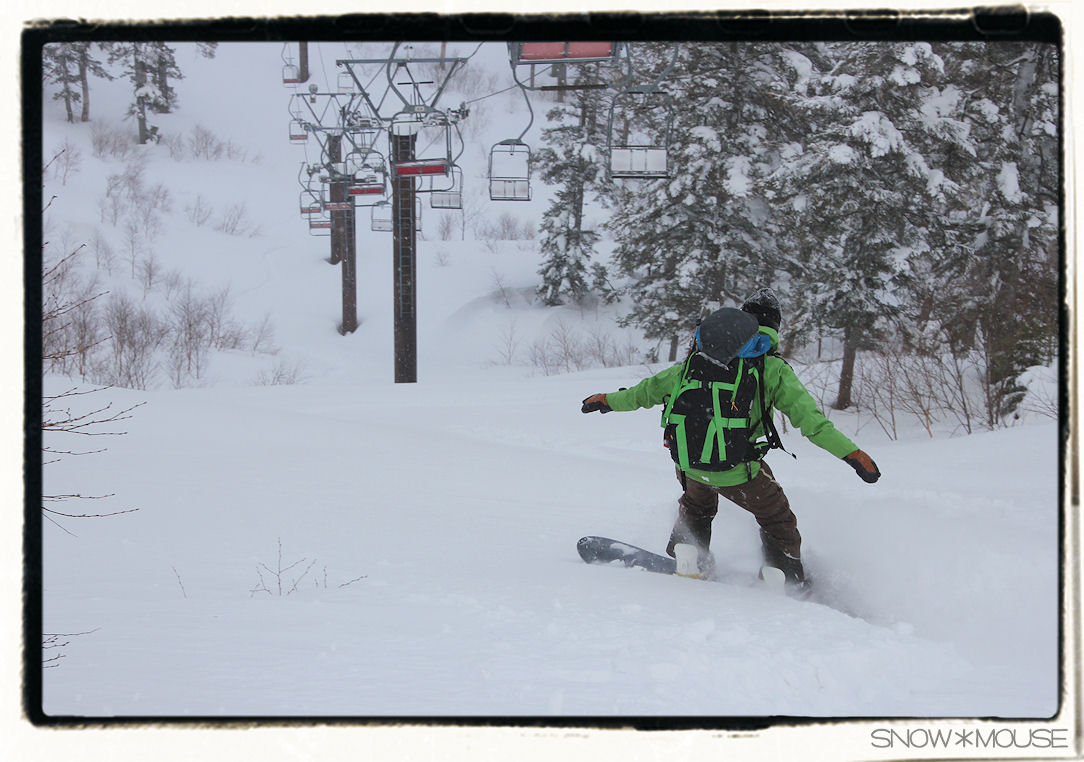 二日目、待ちに待った晴天。ファーストチェアーGET!の後は、新雪深雪でかなり埋まってきた中尾根方面を登り返しては滑り、最後のデザートも美味しく頂き、ビールで乾杯!